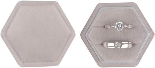 Velvet Ring Box Hexagon - Premium Gorgeous Vintage Double Ring Display Holder with Detachable Lid for Proposal, Engagement, Wedding, Ceremony (Gray)
